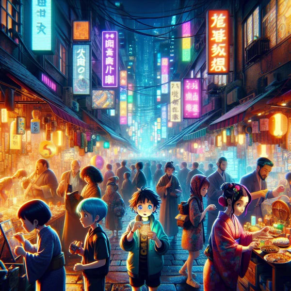 A futuristic Tokyo street market at night, neon lights glowing, anime-style characters shopping