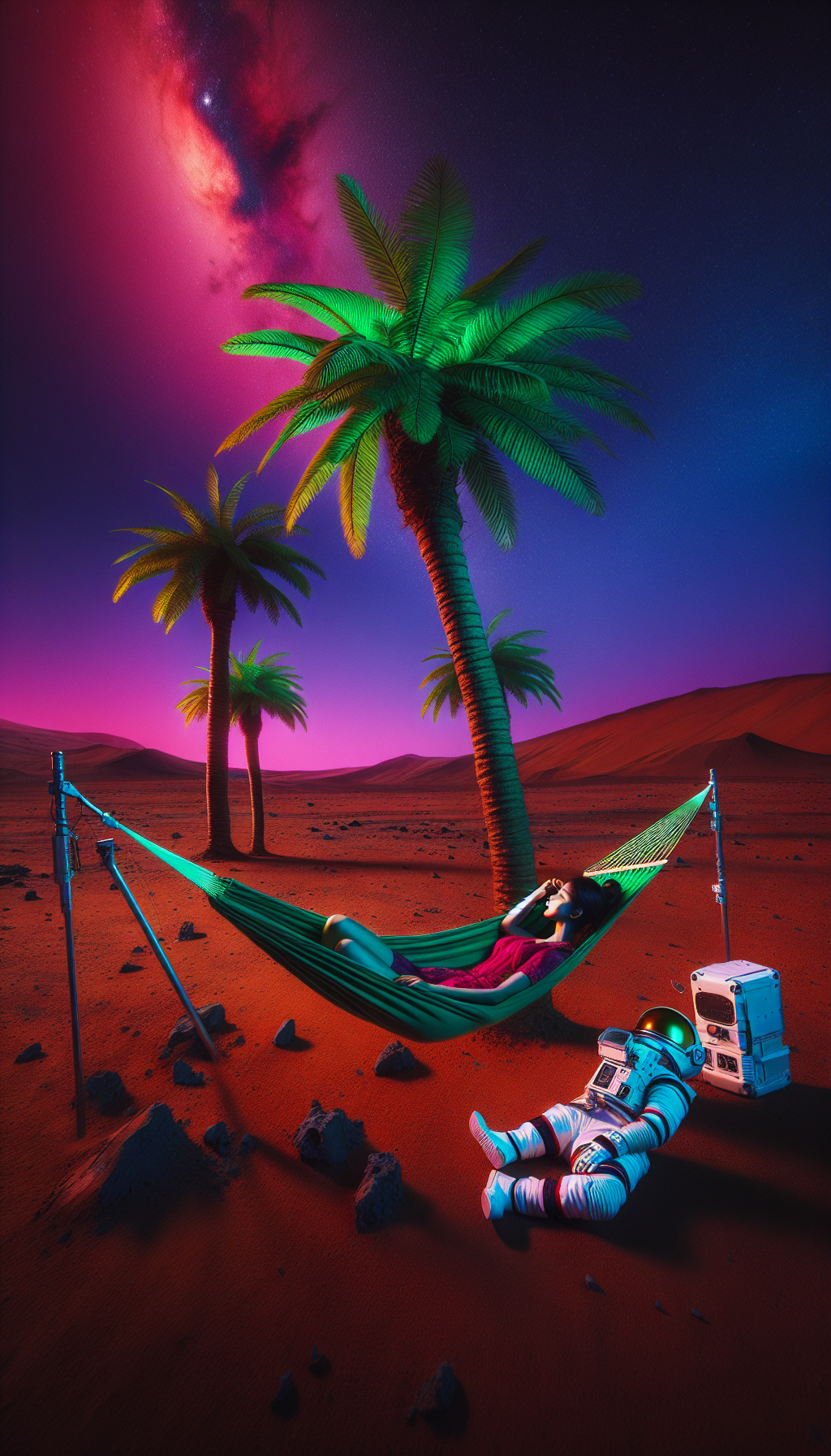 An astronaut relaxing in a hammock between two palm trees on Mars, surreal and colorful